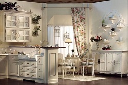 - Кухонные гарнитуры. Основа кухни. Могут быть как модульными, так и выполненными на заказ. Важно, чтобы фасады были светлыми, с филенками или легкой резьбой. Столешница может быть из дерева, натурального камня или керамики.