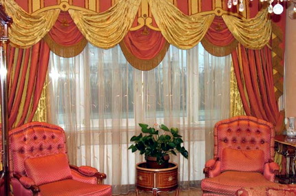 С выбором оттенка штор немного проще, здесь нужно обратить внимание на степень освещенности определенной комнаты и общий ее дизайн. В больших комнатах с огромными окнами лучше смотрятся тяжелые шторы разного оттенка, которые должны только неукоснительно подходить к стилю интерьера, при этом к стилю также должен подходить и их орнамент. Здесь также необходимо учитывать тот фактор, что от стилистического направления дизайна помещения зависит не только выбор: цвета штор, их материала, орнамента и оттенка, но и фактуры. Желательно: для спален, кухонь и детских, которые выполнены в стилях: минимализм, кантри, хай тек и прочих, выбрать гладкие, достаточно простые шторы. Шторы с кисточками, кружевами или вышивкой лучше повесить в помещениях, выполненных в стиле барокко или элегантном классическом стиле.
