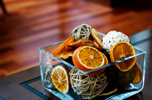 Освежить воздух в помещении помогут и цитрусовые, для этого нарежьте ломтиками лимон или же апельсин, разложите их в небольших вазочках, которые расставьте по всему помещению или же комнатам. Также наберите в пульверизатор холодной воды, капните пару капель любого эфирного масла, добавьте немного сока лимона или апельсина. Перед тем, как приступить к уборке, увлажните пульверизатором воздух, хотя хватает такого разбрызгивания не на много. Неприятные запахи хорошо впитывает смесь из 3-х частей уксуса разбавленного в 1 части воды. Налейте разведенный уксус в блюдце и поставьте в том месте, где вам нужно нейтрализовать запахи, а можете просто распылить смесь из того же пульверизатора.