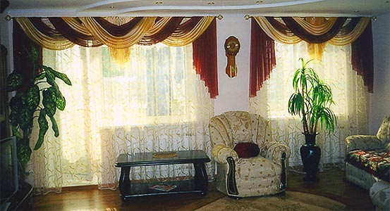 Учитывайте, прежде всего, подбирая шторы, общий стиль интерьера данной комнаты, ее освещение и цветовое оформление. Обратите также внимание на высоту потолка и размеры гостиной. Для не очень просторного помещения не будут смотреться пышные обои, также простовато будут выглядеть тонкие и короткие занавески, если данная комната имеет высокие потолки. Если подобрать шторы под цвет стен, то они могут зрительно сделать комнату больше, при этом они должны быть с мелким рисунком или же просто однотонная ткань. Набивные ткани, а также ткани, имеющие большой рисунок можно смело вешать в большом помещении с высокими потолками.