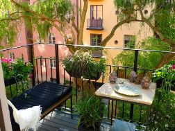 Пару слов о балконной мебели, неплохим вариантом будет садовая мебель: из пластика, металлическая или деревянная, она предназначена для использования непосредственно на открытом воздухе, потому не деформируется от попадания солнечных лучей и дождя. А чтобы отдых приносил лишь удовольствие можно над столиком и стульями установить большой зонт или козырек-маркизу.