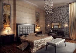 Для интерьера, оформленного в стиле арт-деко, подходит мебель с простыми, но достаточно удобными формами. В спальную комнату подбирается кровать, которая станет главным объектом помещения. Потому стоит выбирать мебель с хромированными ножками, инкрустированную украшением, патиной, с высоким изголовьем.