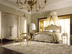 Все элементы должны быть выполнены из натуральной дорогой древесины, и даже на первый взгляд быть массивными. Это касается изголовья и ножек кровати, прикроватных тумбочек, комода или трюмо.