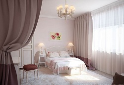 - Для оформления оконных проемов в спальне необходимо выбирать шторы фиолетового либо темно-зеленого оттенка.