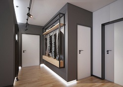 При необходимости и нечастом использовании иные составляющие могут быть исключены из интерьера прихожей. Но стиль хай-тек предпочитает минимизацию затрат пространства и советует использовать вместимую и многофункциональную мебель. Отличным вариантом считается приобретение шкафа-купе с зеркальным покрытием и наличием множества свободных полок для верхней одежды и обуви.