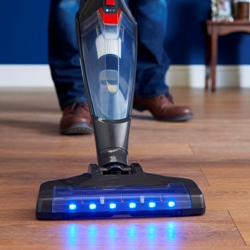 При зарядке на пылесосе активны индикаторы, всего их три, заполняющиеся по мере зарядки. При полной зарядке (первая займёт часа 4, потом меньше) они постепенно заполняются. Также светодиоды расположены на щётке устройства: подсвечивают область перед собой. Наверное, должно быть удобно для уборки в плохоосвещённых местах. Также это может быть неплохим подспорьем для слабовидящих. Но как по мне, это больше ставка на дизайн, ну нет в этих светодиодах никакой необходимости, только заряд потребляют.