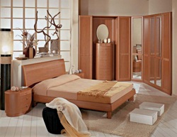 Японский стиль своеобразный, но не менее популярный. Главное его правило комфорт и ничего лишнего. Мебель подойдет только из натурального материала. Кровать выбирают с небольшим матрасом на деревянной подставке. Отличным дополнением станет столик с прямоугольной скамьей, тумбочки и шкаф купе.