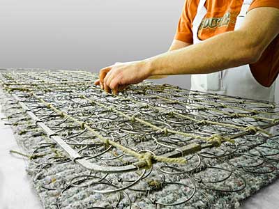 Если же пружины крепятся к каркасу тканевыми ремнями, то ремни нужно убрать и заменить деревянными рейками, а каждую пружину закрепить на них гвоздями. Желательно их выравнивать по уровню. Для установки таких реек на каркасе, в отмеченных местах нужно сделать пазы, в которых гвоздями крепятся рейки. Закрепленные на каркасе рейки нужно обвязать мягким шнуром 5мм толщиной. Между рядами пружин вбейте гвозди, к которым нужно будет привязать каждую пружину, а когда это будет сделано, пружины закрываются мешковиной и обивочной (декоративной) тканью, края которой прибиваются, по периметру каркаса матраса, мебельными гвоздями или степлером.