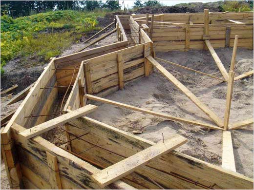 В роли внутренних стяжек можно использовать прочную проволоку, такие стяжки нужны, чтобы избежать разрушения опалубки из-за бокового давления свежего бетонного раствора. Доски с лицевой стороны, которые используются для изготовления щитов, нужно прострогать, чтобы их поверхность была гладкой. Вплотную к доскам, с внешней стороны, нужно забить в землю колья, но нужно забивать их на такую глубину с учетом, что после заливки на них будет приходиться большое давление бетона. По мере объема заливаемого фундамента используются щитовые соединения, для чего нужно внутри установить брус сечением около 5 см, а снаружи прижимные колья и доски.