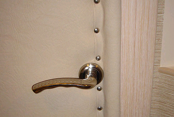 Определенной длины гвоздями прибейте верхний и нижний края полотна, шляпки которых должны располагаться под нижним и верхним валиком. Таким же образом производится установка остальных валиков, обеспечивающих движение дверного полотна внутрь валика. При этом нужно следить, чтобы полотно не перекосилось и последней закрепляется та сторона, на которой монтируются петли. В завершение двери декорируются по заранее выбранному рисунку мебельными гвоздями, которые препятствуют поролону смещаться вниз. Также между гвоздями можно натянуть декоративную леску или стальную струну. Для замочной скважины нужно вырезать отверстия, закрепить на дверях ручки и навесить оббитое полотно на место.