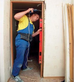 Пока затвердевает пена, можно приступить к прикручиванию петель к дверям. Считается идеальным вариантом, когда нижняя петля находится от нижнего края - на расстоянии 20-25 см, а верхняя петля от верхнего края – на 15-20 см. Место крепления петель, аккуратно, «выбирается» стамеской – на глубину их толщины. Когда высохнет пена, тоже нужно сделать и с коробкой, вставив двери и отметив расположение петель на ней. Прикручиваем половинки петель саморезами или шурупами и навешиваем дверь. Осталось только срезать вылезшую пену и прибить наличники. Как видите, работа довольно не трудная, но за символическую плату это сможет сделать и профессиональный плотник.