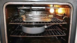 Духовку нужно разогреть до температуры 120 градусов, затем выключить. Взять две емкости, в одну налить воду и поставить на нижнюю полку в духовке, в другую нашатырный спирт и поставить на верхнюю полку. Далее нужно закрыть духовой шкаф и подождать 10 - 12 часов. После этого протереть поверхность салфеткой.