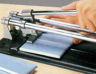 После произведения надреза плитки, в дальнейшее ее нужно надломить с помощью имеющегося на плиткорезе металлического зуба, имеющегося на щипцах и уголке плиткореза. Если понадобится отрезать несколько плиток одинакового размера, то на плиткорезе имеется линейка-ограничитель, которая позволяет, без особых усилий, многократно отрезать плитку по установленному размеру. Хотя, не менее качественно можно произвести распил напольной плитки с помощью камнерезной машины, но выбирая при покупке данный инструмент, стоит учитывать то, что от быстроты вращения фрезы напрямую зависит качество реза напольной плитки. Работая данным инструментом, помните, что для получения качественного надреза сначала нужно от дальнего края плитки к себе сделать линию реза. Которая должна быть максимально ровной, чего можно добиться при равномерном надавливании на инструмент, в результате вы должны получить видимую канавку.