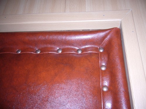 На обивочном материале, используя декоративные гвозди, выложите рисунок. Однако не набивайте их слишком много, иначе прессованный утеплитель не будет держать тепло достаточно хорошо. Шляпки гвоздей должны обязательно выступать на поверхности искусственной кожи, так вы сможете вокруг них обернуть струну из латуни, а уже потом гвозди можно забить полностью.