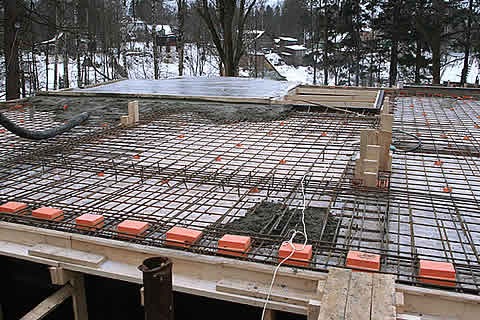 Чтобы раствор бетона не выпадал с боков, сделайте со всех боков опалубку. Заливку можно делать вручную или специальным оборудованием, как, к примеру, бетононасос либо колоновидная вагонетка, оснащенная выдвижным дном. В данную вагонетку бетон загружают непосредственно на земле и поднимают краном. Заливать можно бетон сразу или же частями, однако при этом необходимо следить, чтобы эта смесь не высыхала полностью. Бетонный слой должен быть толщиной примерно 10 сантиметров, но он может быть и чуть больше.