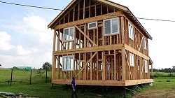 Далее надо качественно утеплить подпол, смастерить черновой дощатый пол, настелить на него фанерные листы в разбежку с оставлением технологических зазоров. Каркасы стен собираются на полу, потом поднимаются, крепятся на своем месте, обшиваются. Затем обустраивается перекрытие, стропильный комплекс, крыша.