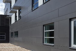 - фасад с вентиляцией из HPL-панелей – один из самых популярных типов. Они делаются из бумажно-слоистых элементов пластика путем прессования. Каждый следующий слой прессования проводится под воздействием высокого давления, что делает панели более прочными;