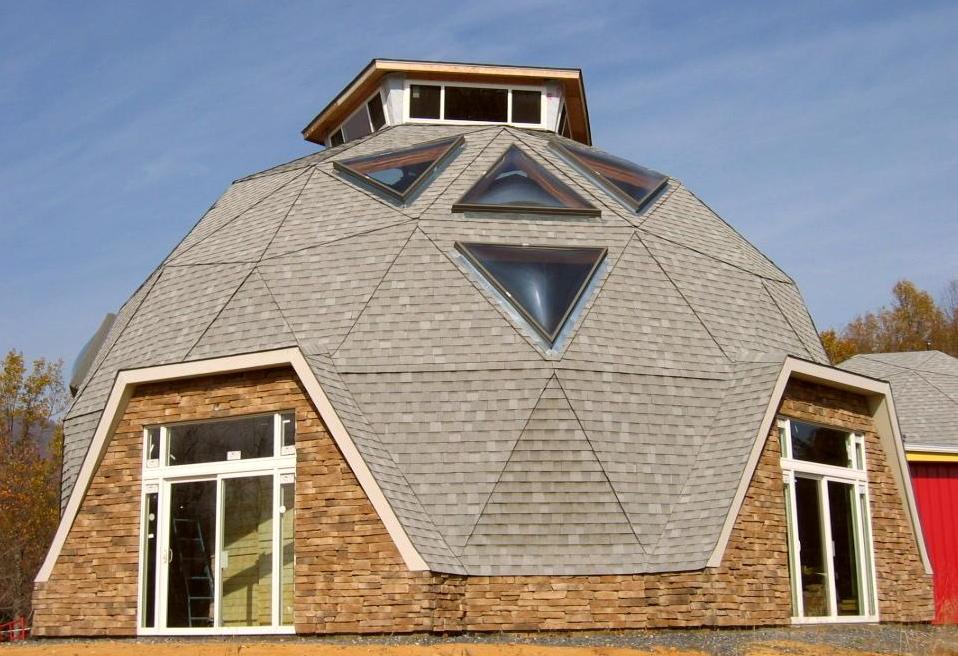 Также имеется иной способ строительства дома с геодезическим куполом, который собирается из отрезков разно-длинных прямых брусьев. Как правило, данная конструкция купола не нуждается в дополнительной опоре так, как его детали соединяются коннекторами. После того, как купол будет возведен, можно приступить к обшивке внутренних полов и стен досками. Меж балками снаружи прокладывается базальтовая вата, и дом обшивается осб плитами, а купол покрывается водоотталкивающим и антибактериальным средством и обшивается он битумной черепицей.